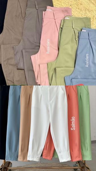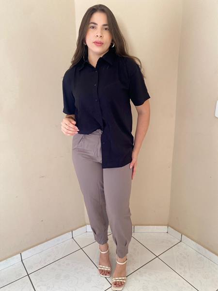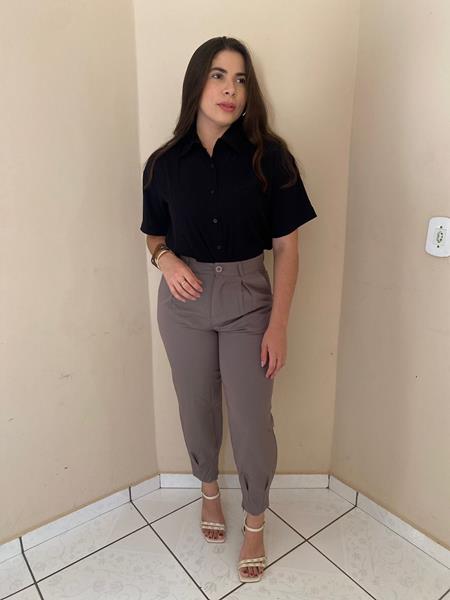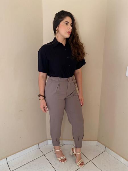 Possui modelagem cenoura, com cintura alta e pernas levemente afuniladas, valorizando a silhueta com elegância.